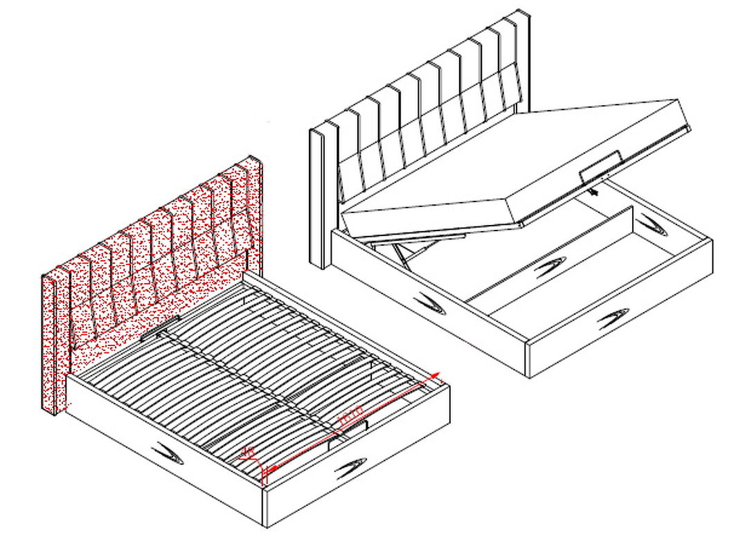 Кровать оснащена подъемным механизмом и ящиком для хранения.