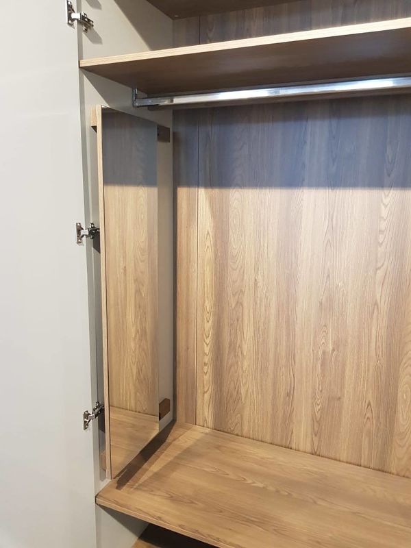 В левой секции гардероба находится удобное ростовое зеркало. В правой секции — выдвижные ящики с замком.