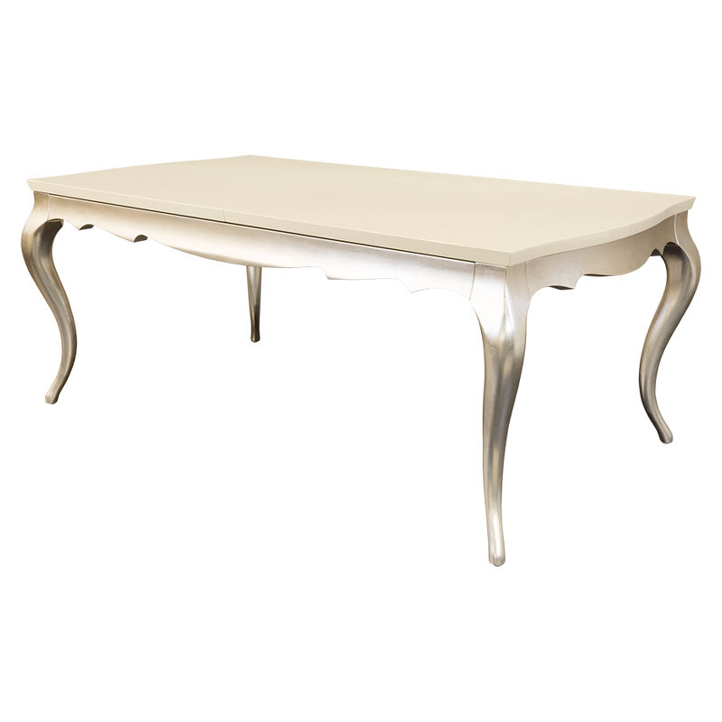Обеденный стол раздвижной, отделка столешница перламутровый кремовый лак, основание серебряное напыление