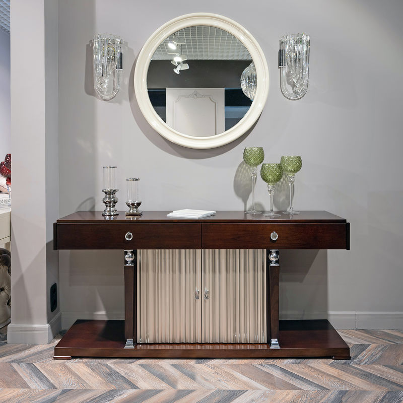 Консоль с 2 ящиками в стиле неоклассика от итальянского бренда Fratelli Barri. Модель имеет фронтальную часть в отделке серебряным напылением. К консоли можно подобрать идентичную по дизайну прикроватную тумбочку, кровать и другую мебель.