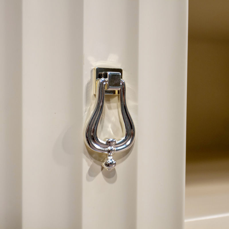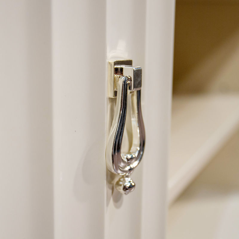 Модель изготовлена из высококачественной МДФ высокой плотности и массива дерева. Тумба имеет 2 открытые полки в центре и 2 дверцы по бокам. За каждой дверкой - полка. Внутренние полки белого цвета. Цвет фурнитуры - хром. Отверстий под провода производителем не предусмотрено.