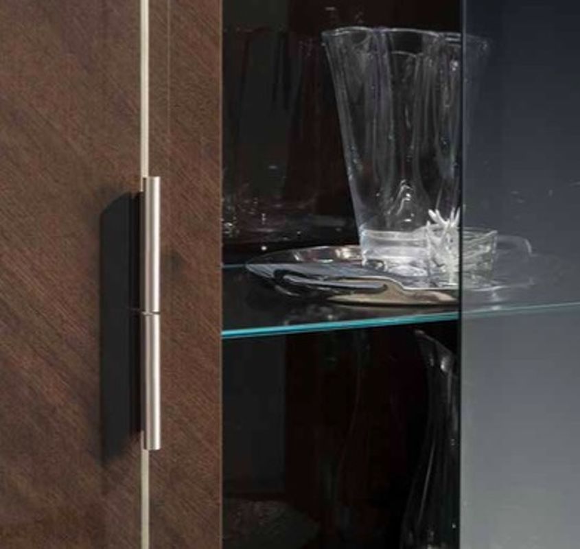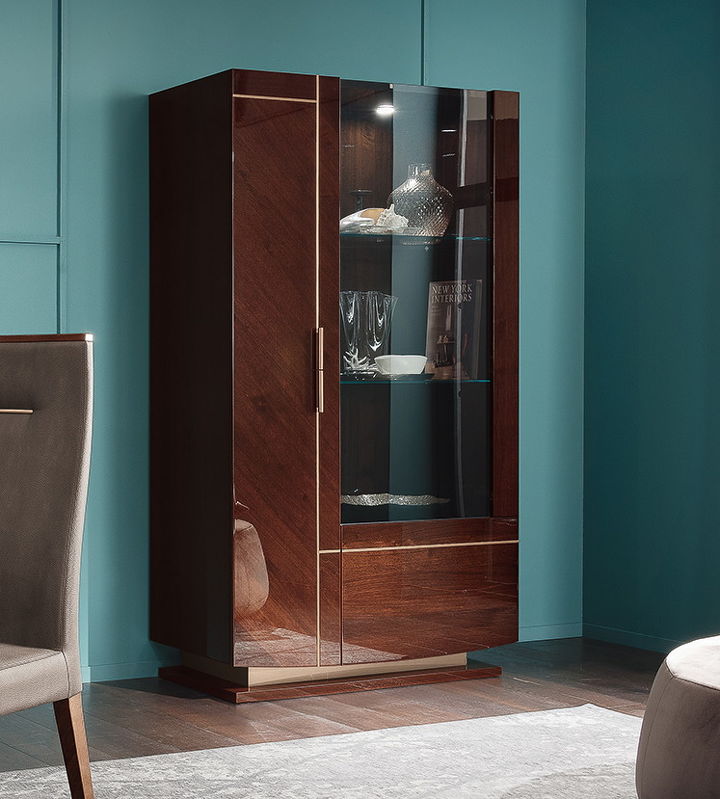 Элегантная витрина Bellagio от итальянской фабрики ALF Italia, с одной стеклянной и одной деревянной створкой. Для отделки использован шпон натурального ореха кофейного оттенка, покрытый глянцевым лаком. Металлические профили цвета розовое золото с округлыми ручками создают оригинальный геометрический мотив.