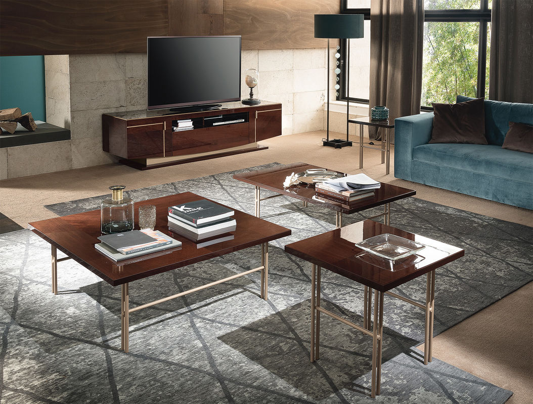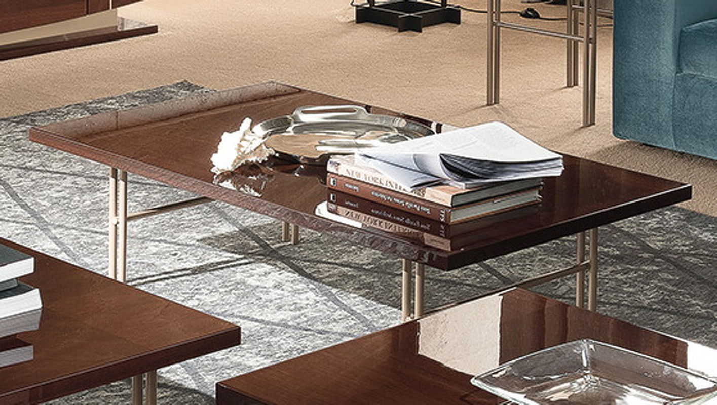 Прямоугольный журнальный столик Bellagio от итальянской фабрики ALF Italia, выполнен в современном стиле. Для отделки использован шпон натурального ореха кофейного оттенка, покрытый глянцевым лаком, металлические ножки цвета розовое золото.