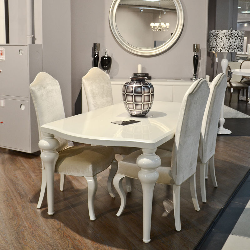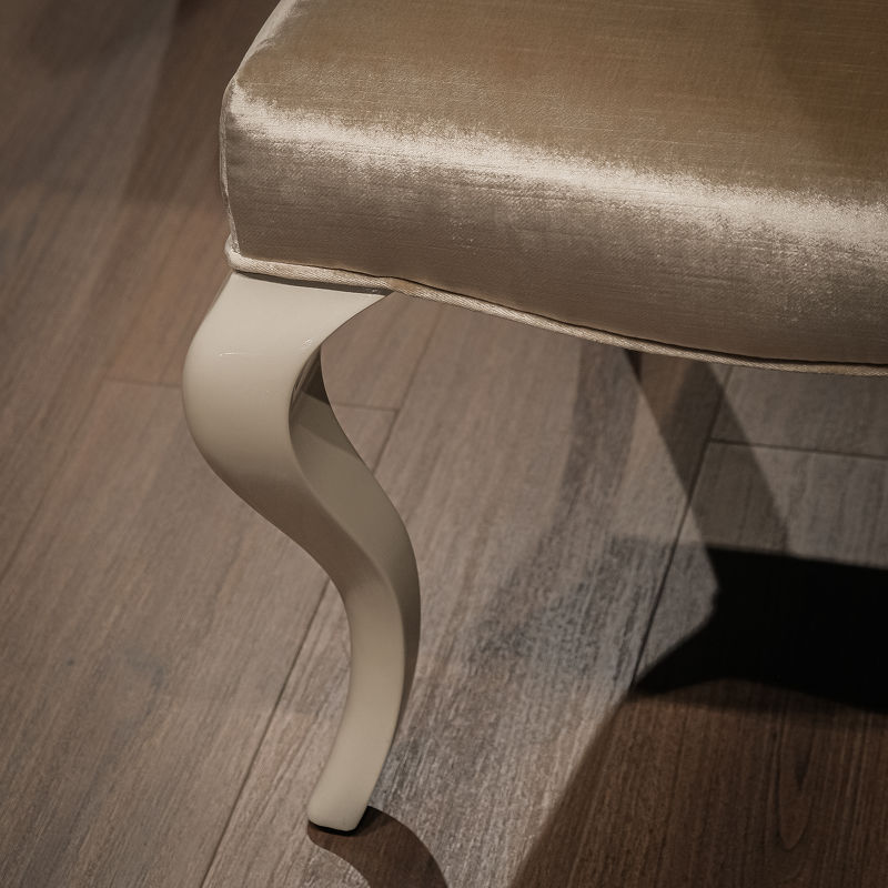 Стул с высокой спинкой и мягким сидением выполнен в стиле Ар деко. Изогнутые ножки покрыты сверкающим жемчужным лаком. Обивка — ткань из коллекции фабрики. Сделан из массива дерева.