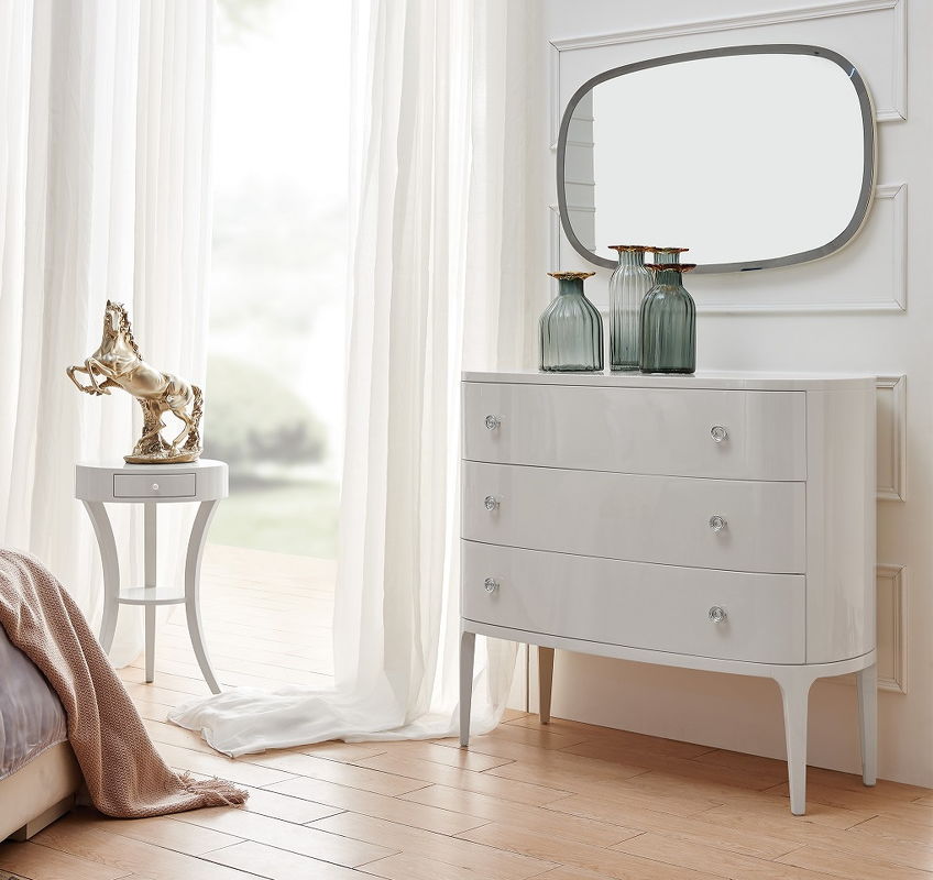 Комод на высоких ножках выполнен в стиле ар деко. Оснащен тремя выдвижными ящиками. Скругленные углы и плавные линии подчеркивают оригинальность модели.