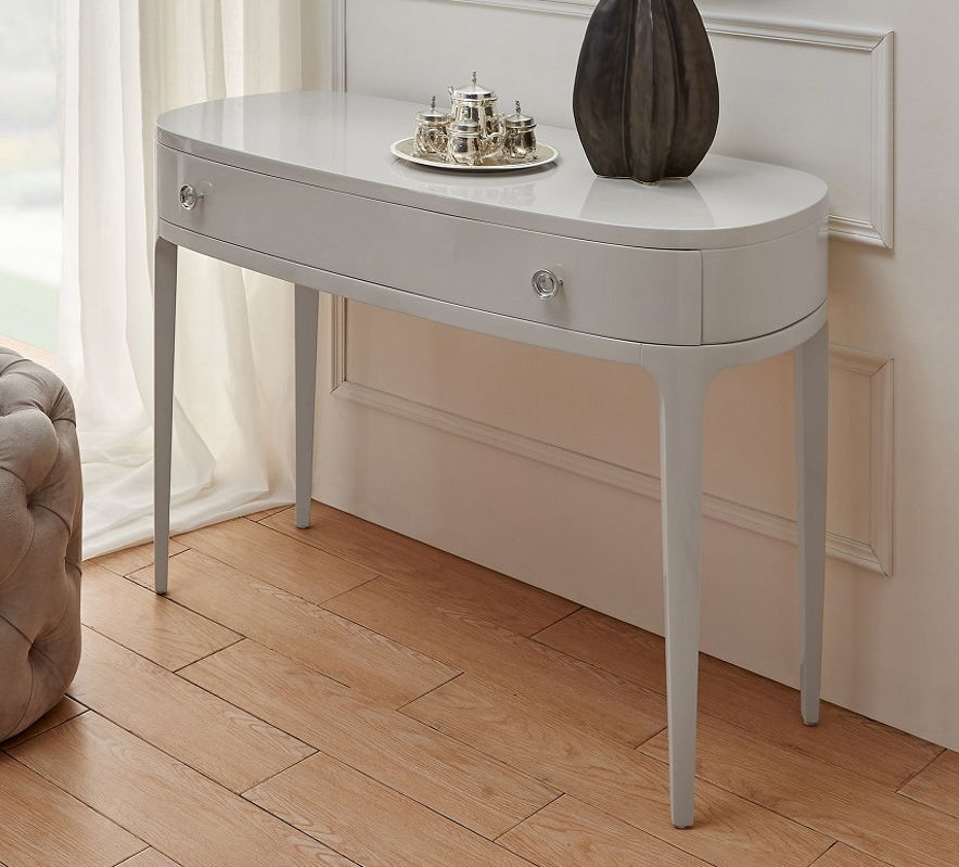Консоль на высоких ножках выполнена в стиле ар-деко. Оснащена выдвижным ящиком. Скругленные углы и плавные линии подчеркивают оригинальность модели.
