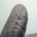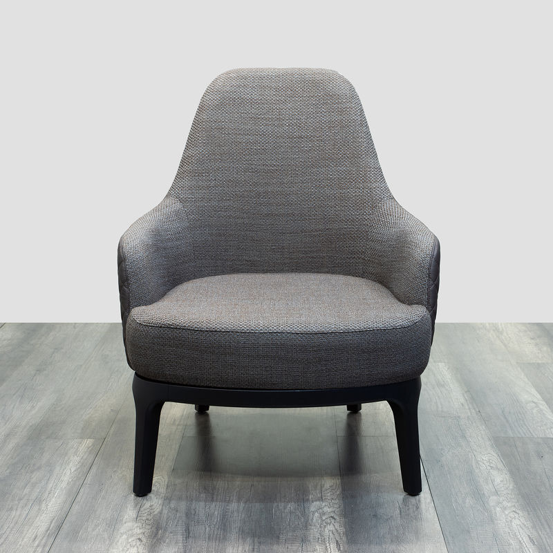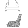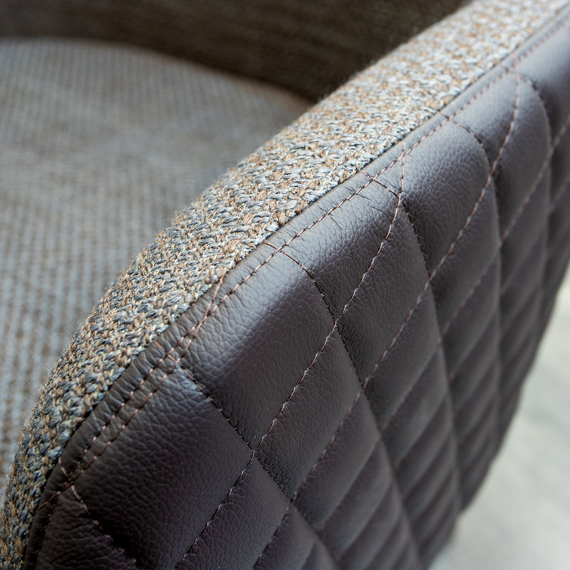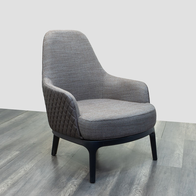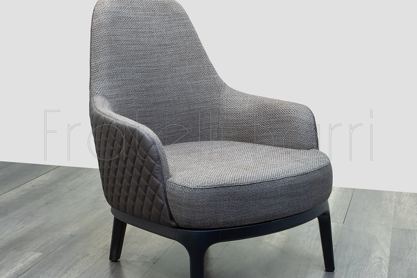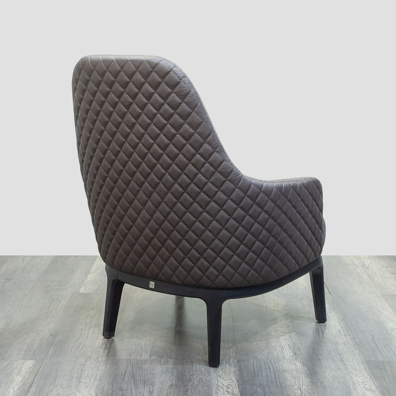 Кресло на деревянном основании из ясеня выполнено в стиле модерн. Декорировано ромбовидной стежкой. Низкая спинка и загнутые подлокотники подчеркивают стиль модели.