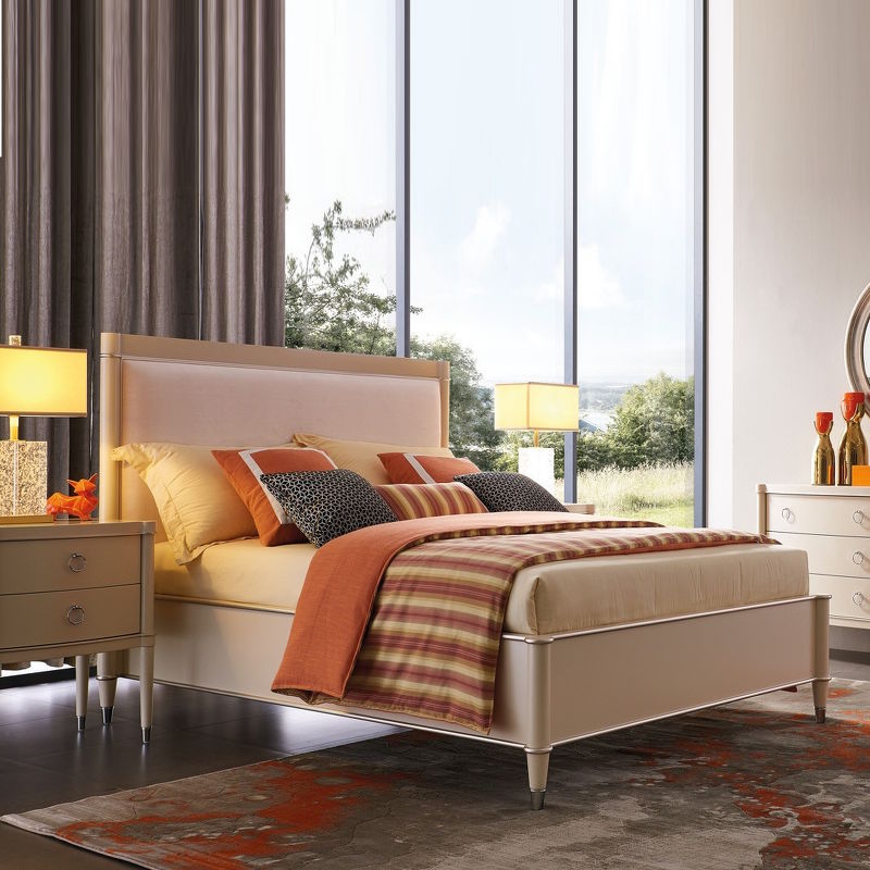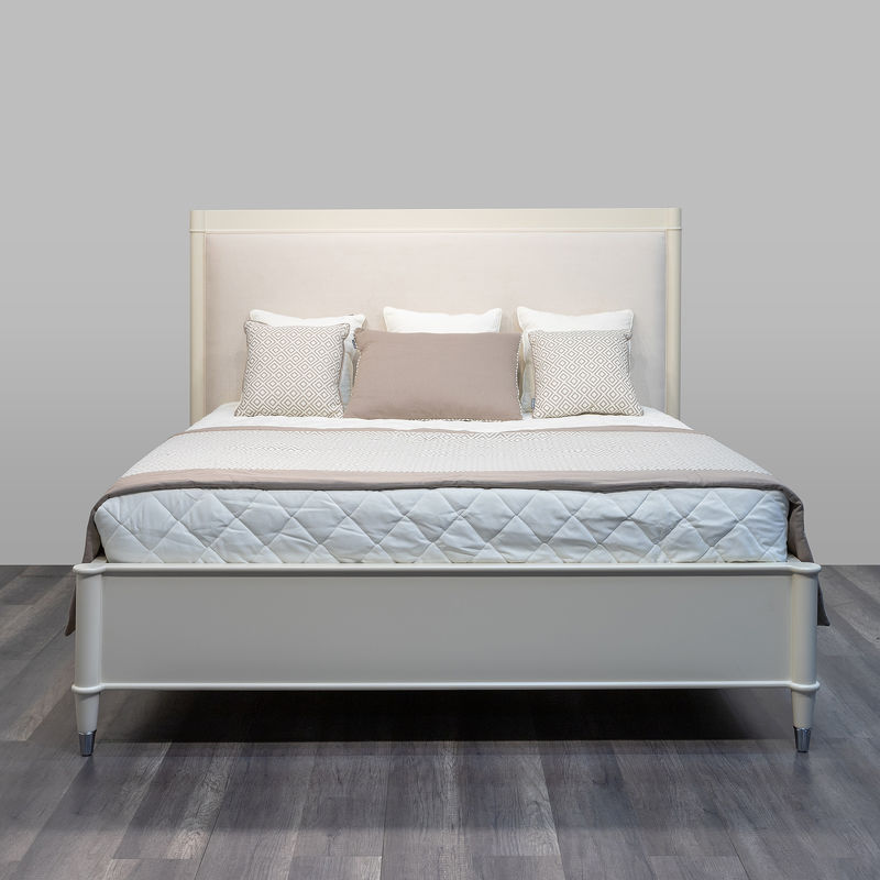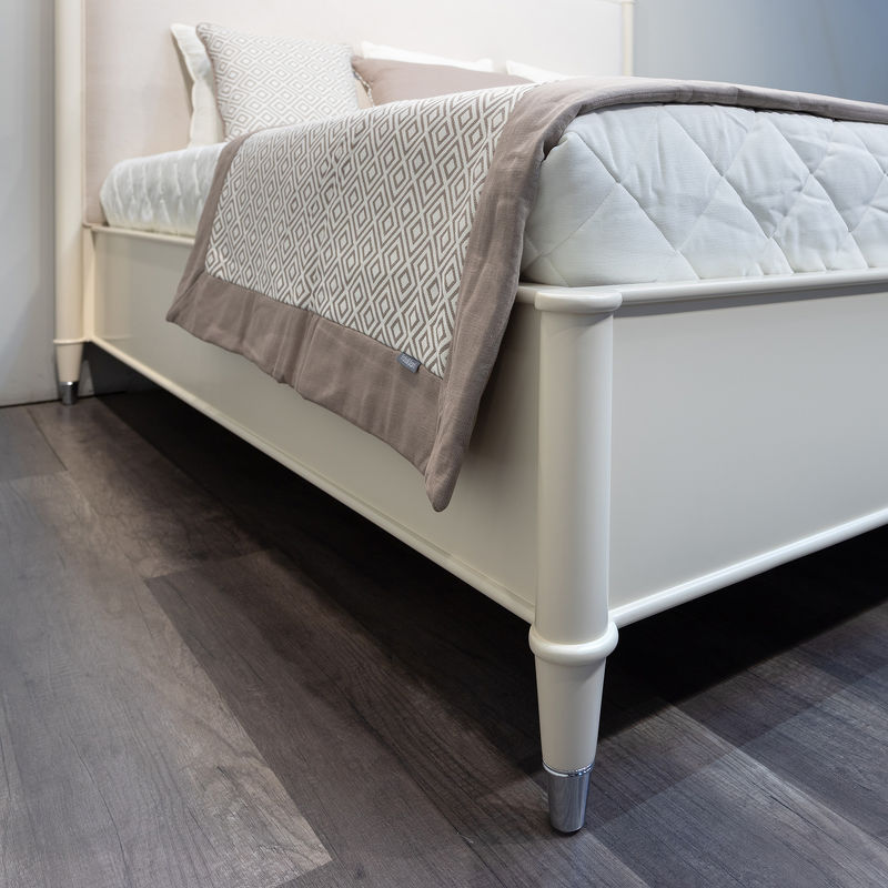 Высокая кровать от итальнякого бренда Fratelli Barri с прямыми ножками и мягким изголовьем в стиле неоклассика. Основание кровати полностью в отделке бежевый матовый лак. На ножках металлические колпачки.