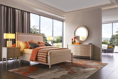 Кровать выполнена из массива дерева и высококачественного МДФ класса Е1. Изголовье обито тканью из коллекции фабрики в бежевых тонах. Тип ткани - велюр. Состав ткани - 80% полиэстер, 20% нейлон. Цвет фурнитуры - хром.