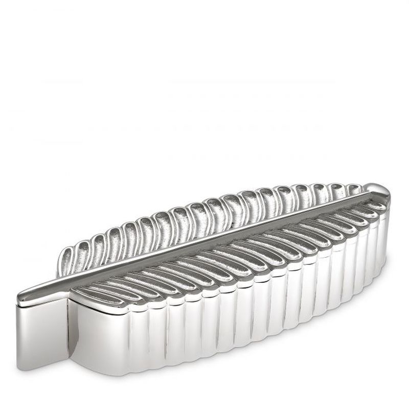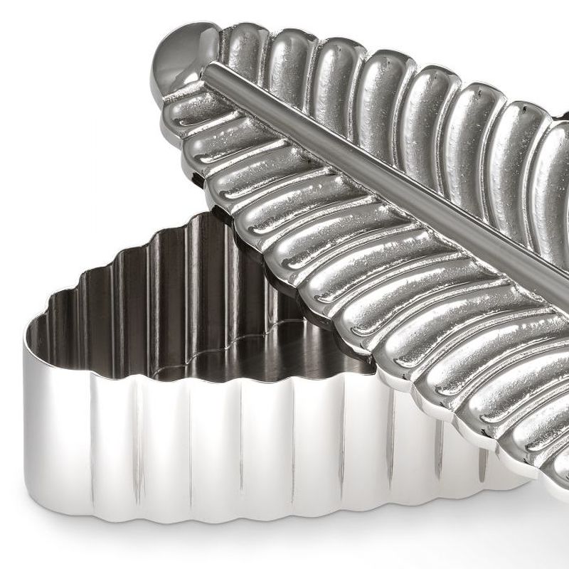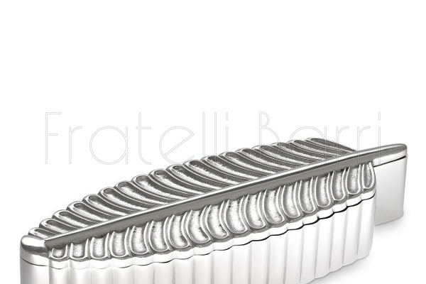 Эта декоративная шкатулка в форме пера выделяется своим красивым рельефом и блестящей отделкой из полированного никеля.
