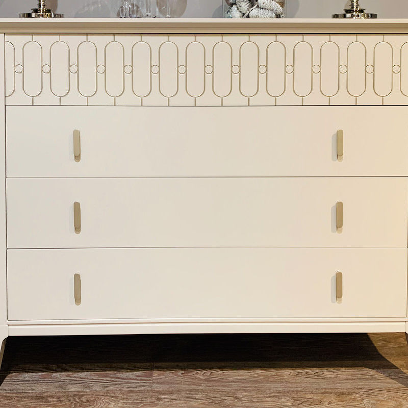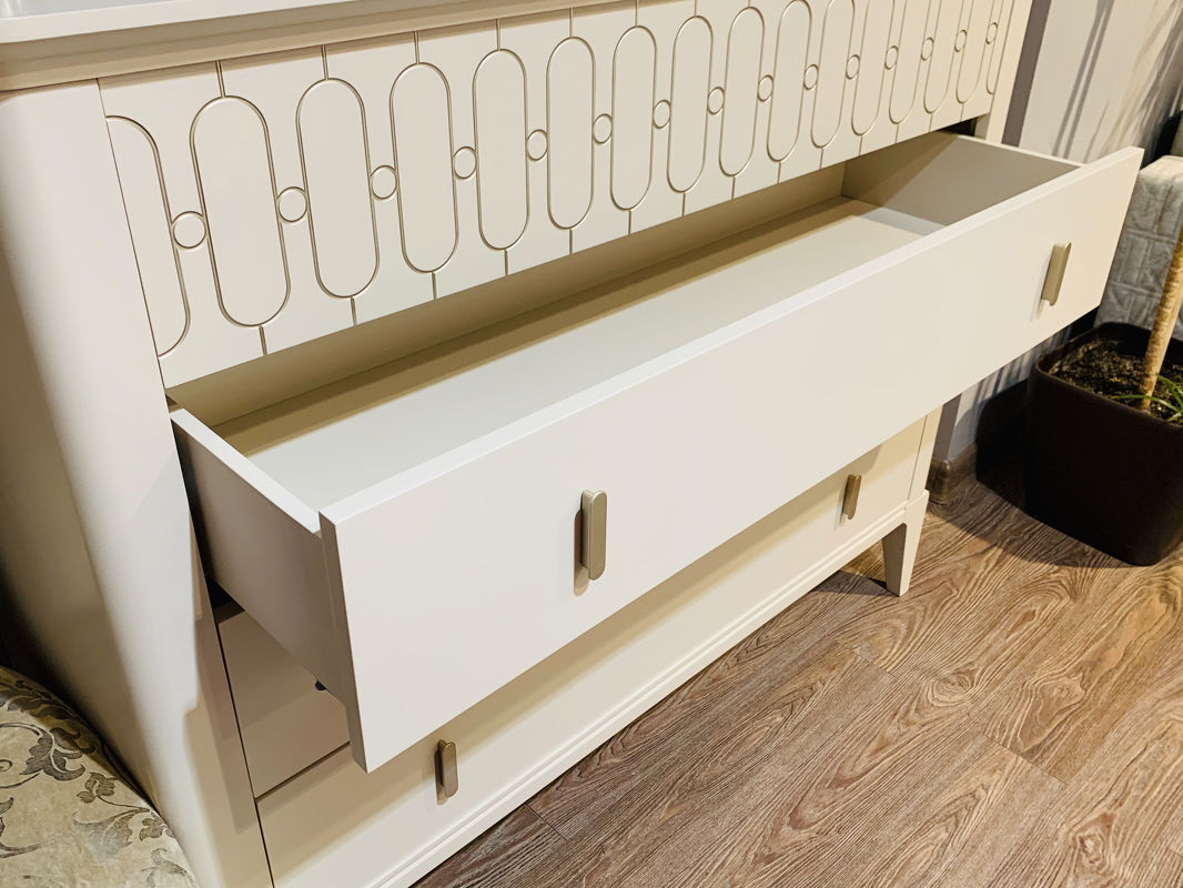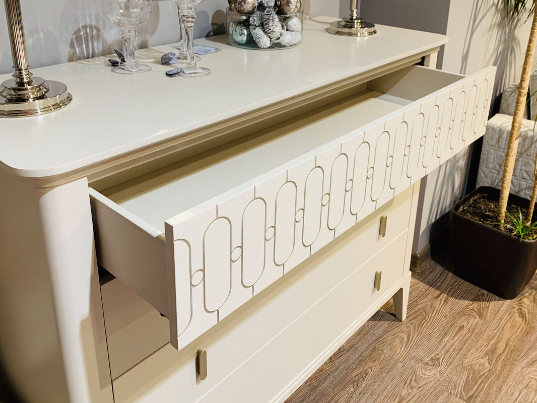 Комод на прямых ножках выполнен в стиле ар-деко. Оснащен четырьмя ящиками, верхний ящик с системой открывания push to open декорирован гравировкой.