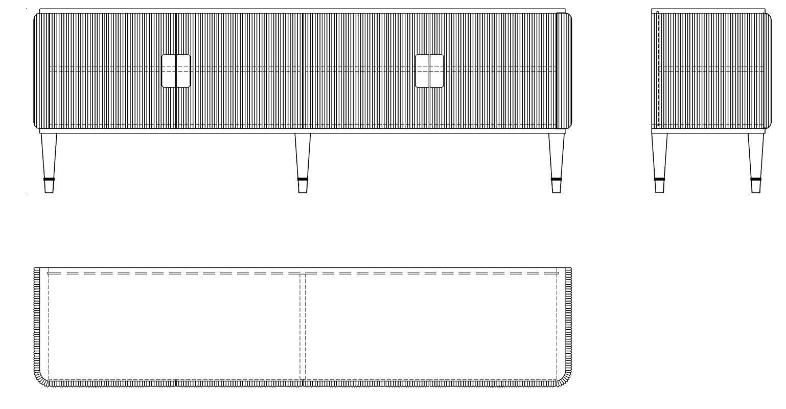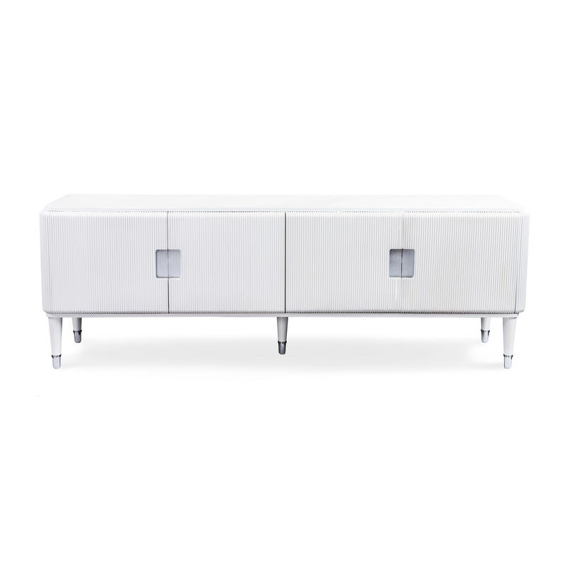 Тумба для телевизора от итальянского бренда Fratelli Barri. Закругленная форма и рифленые фасады выглядят очень актуально. Ножки прямые круглые, зауженные к низу. На ножках металлические колпачки. У тумбы 2 отделения, 4 распашные дверки. В каждом отделении 1 полка. Ручка - выемка на фасаде. Вставка за ручкой - металлическая пластина. Отверстий под провода производителем не предусмотрено.
