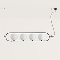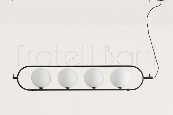 Подвесная конструкция из стали в черном матовом цвете и круглыми плафонами из белого матового стекла.