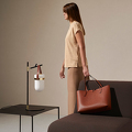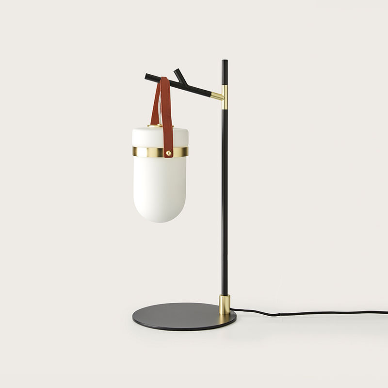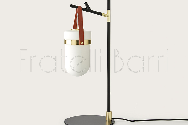Настольная лампа Almon, отделка черный матовый, матовая латунь, белое матовое стекло, светло-коричневая кожа
