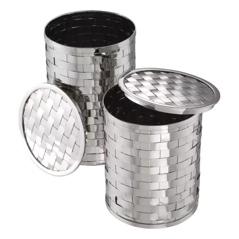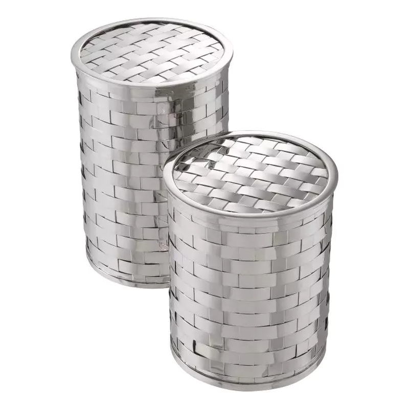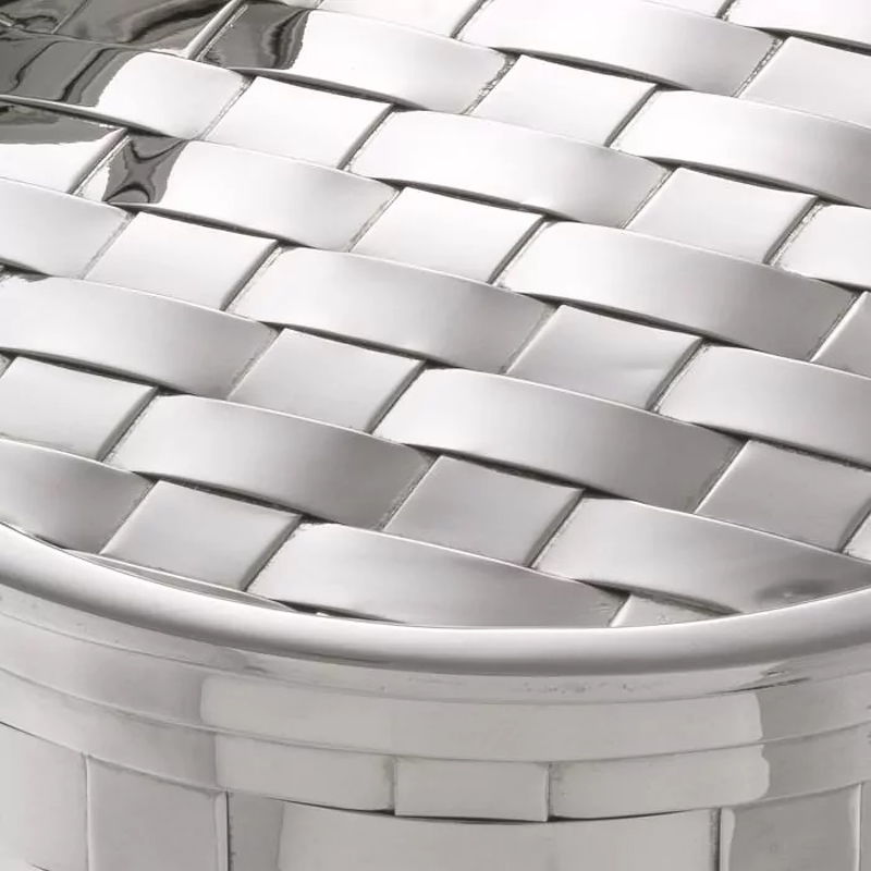 Внутри есть место для хранения мелочей или украшений, что делает его очаровательным предметом для туалетного столика. Каждая коробочка, отделанная полированным никелем, украшена привлекательным плетеным рисунком.