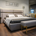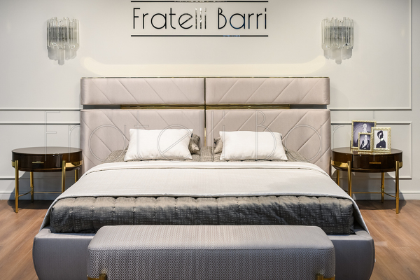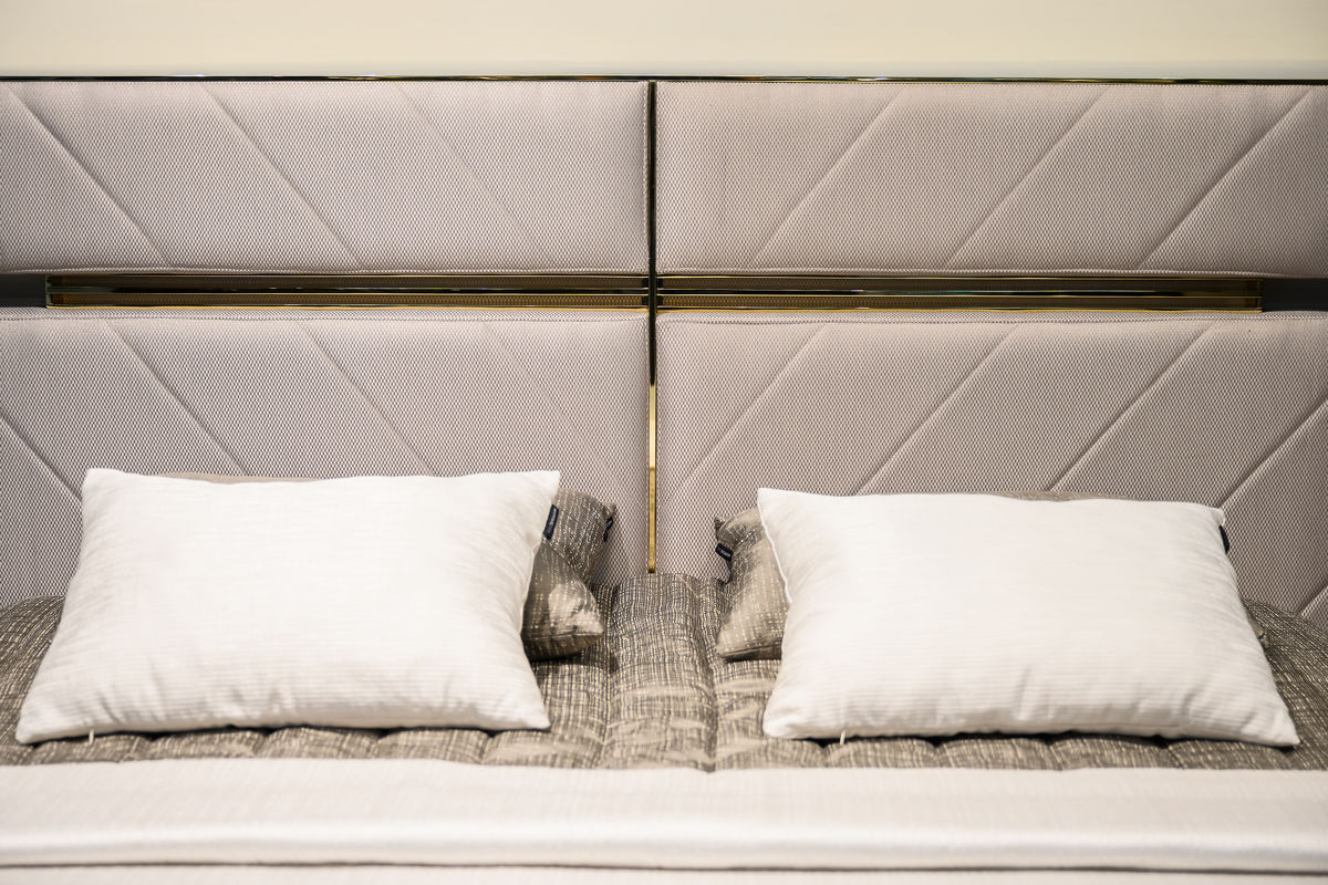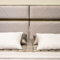 Мягкое изголовье c диагональной стежкой обито тканью из ассортимента фабрики. Фабрика представляет большой выбор тканей производства Италия, Испания, Бельгия и Турция. Кровать декорирована металлическими деталями.