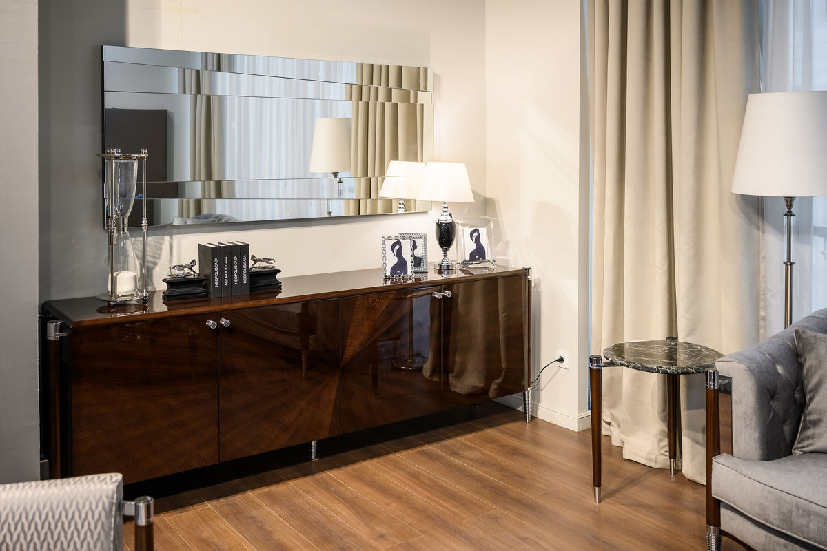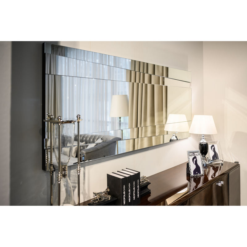 Зеркало выполнено в стиле Ар-деко. Зеркало на каркасе из высококачественного шпонированного МДФ высокой плотности. Декорировано полосами.
