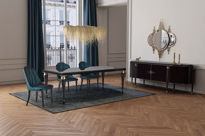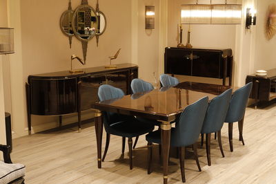Буфет с распашными дверками выполнен в стиле Ар-деко. Буфет изготовлен из высококачественного шпонированного МДФ высокой плотности. Детали из нержавеющей стали с латунным покрытием.