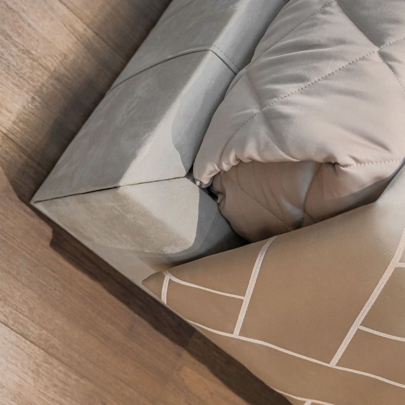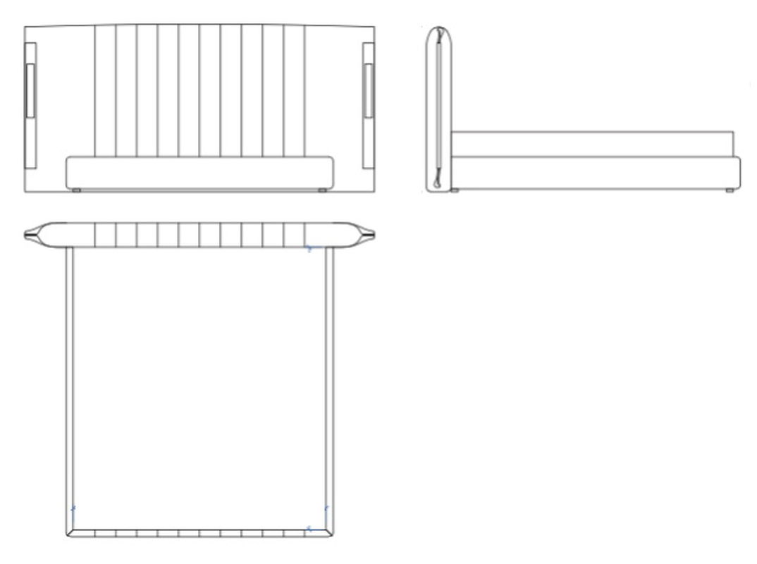 Двуспальная кровать с интересным силуэтом и обивкой изголовья и базы тканью. Модель дополнена вертикальной стежкой и деталями из полированной стали. По бокам изголовья есть необычные «уши», очень популярные в 2024 и 2025 году.