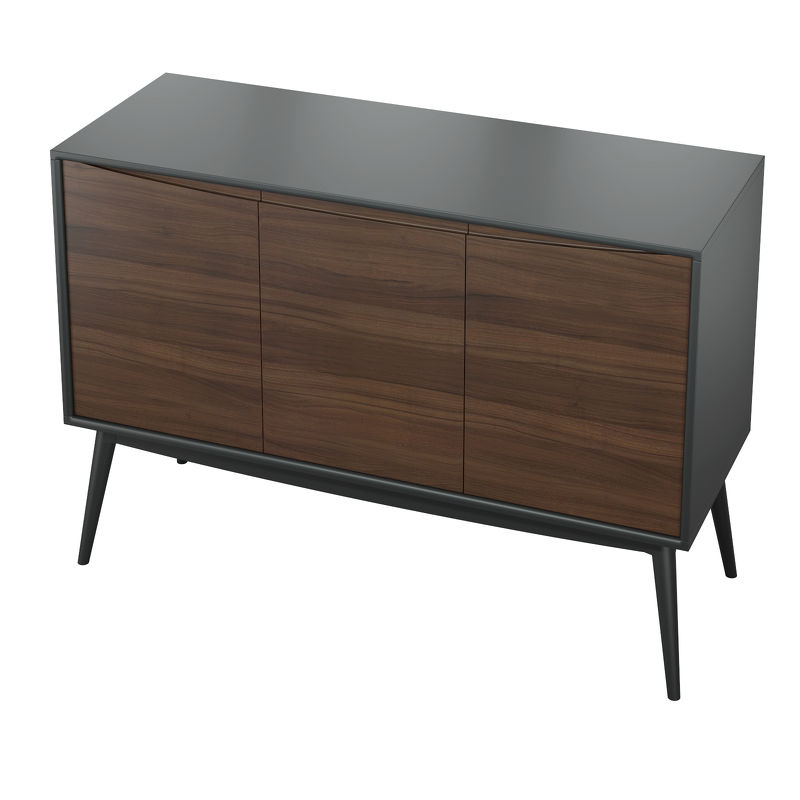 Дизайнерский буфет на высоких ножках из коллекции Sevilla от MOD Interiors — сочетание современного дизайна, где геометрическая простота форм сочетается с благородством отделки. Изготовленный из МДФ с отделкой в шпоне американского ореха и матовым серым лаком, он привносит в интерьер визуальную легкость.