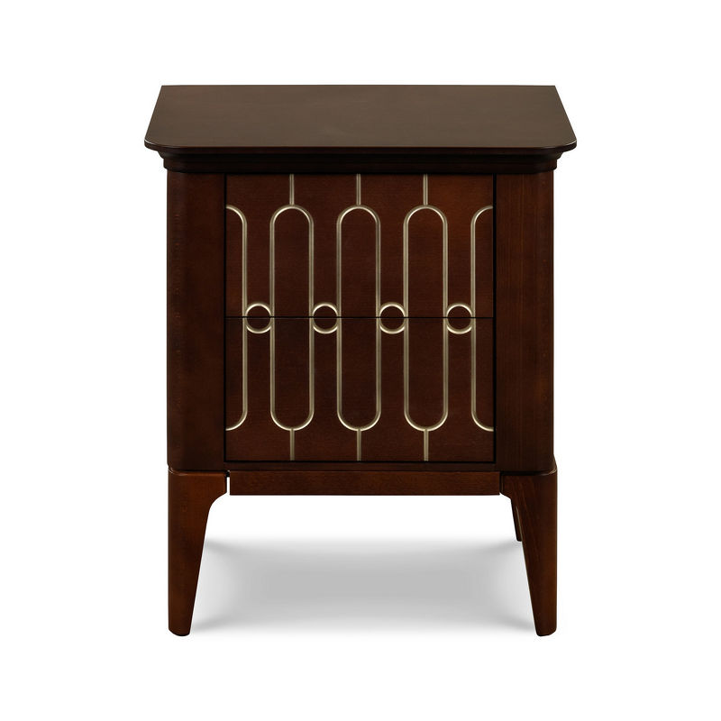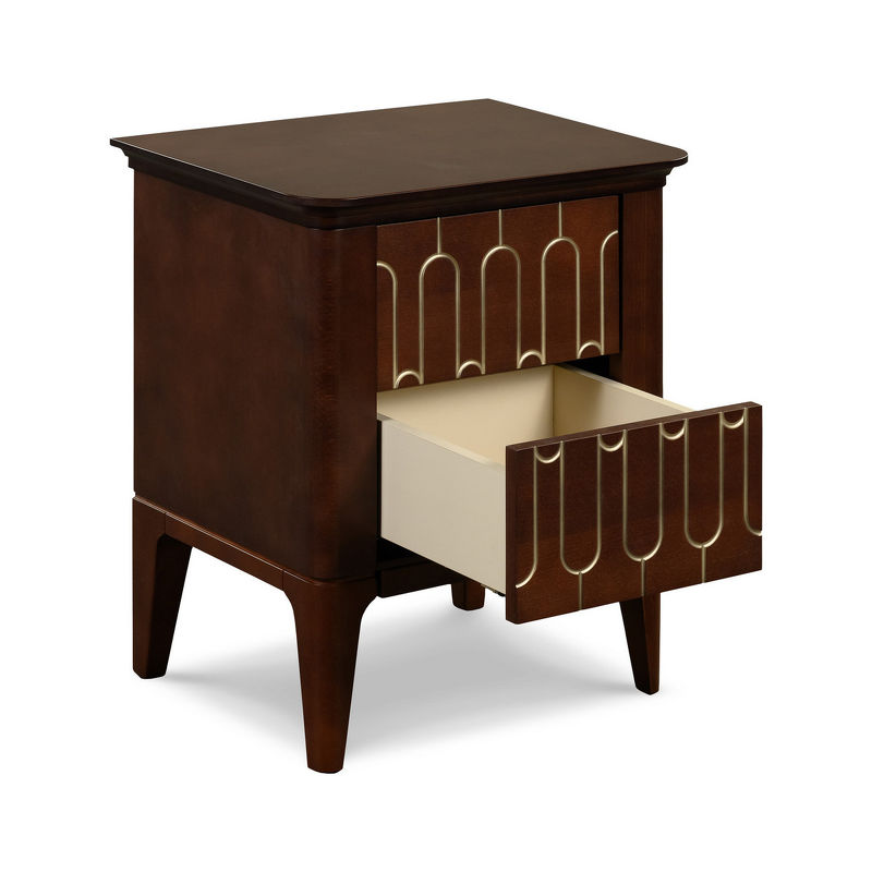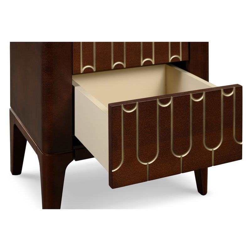 Прикроватная тумбочка на прямых ножках выполнена в стиле ар-деко. Оснащена двумя ящиками с гравировкой на фасадах и системой открывания push to open.
