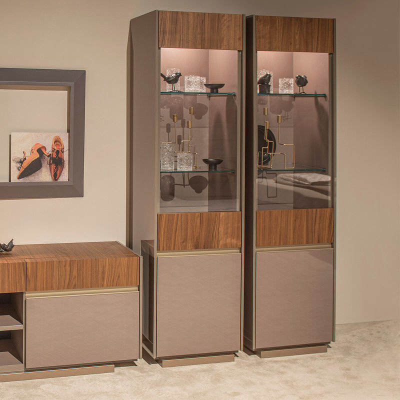Витрина Corso Como c распашной дверкой от итальянской фабрики ALF Italia представлена в современном стиле. Отделка - натуральный шпон ореха в сочетании с глянцевым лаком. Наполнение стеклянные и деревянные полки, подсветка.