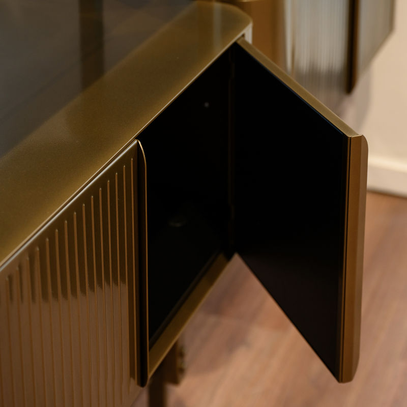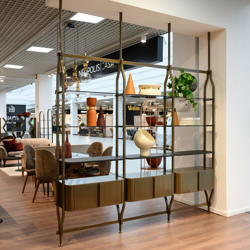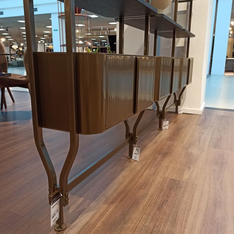 Стеллаж Charlotte, отделка M328 состаренная латунь, C158 дымчато-серое стекло, L038 шпон дуба charcoal,