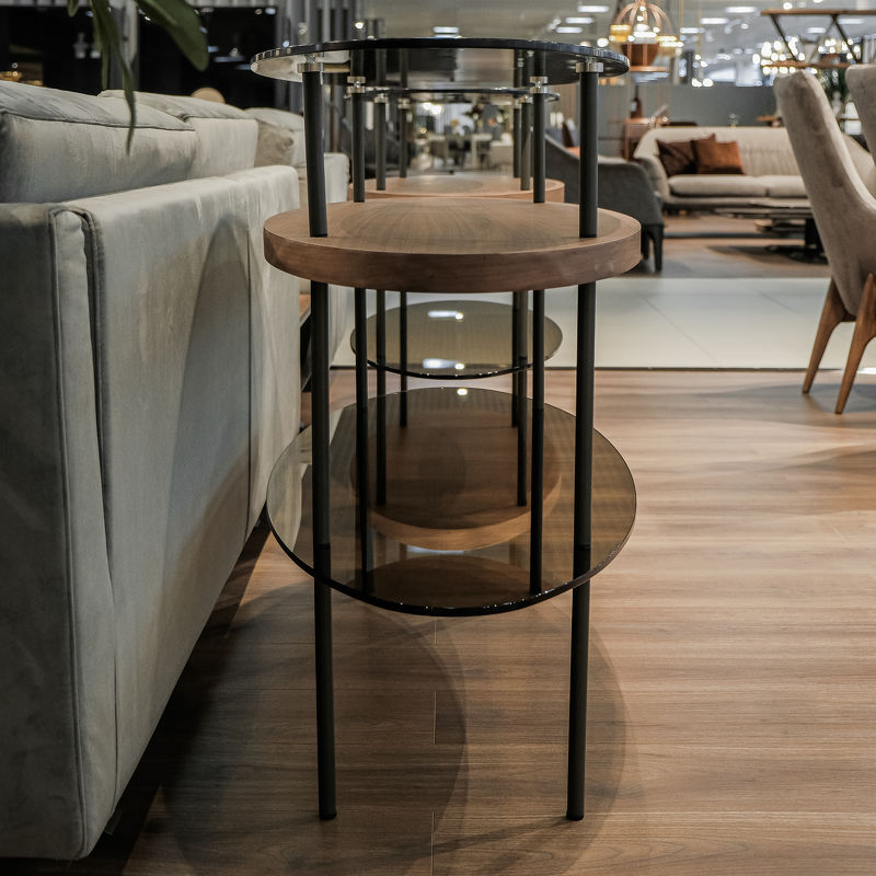 Каркас изготовлен из металла и дополнен деревянной и двумя стеклянными столешницами.