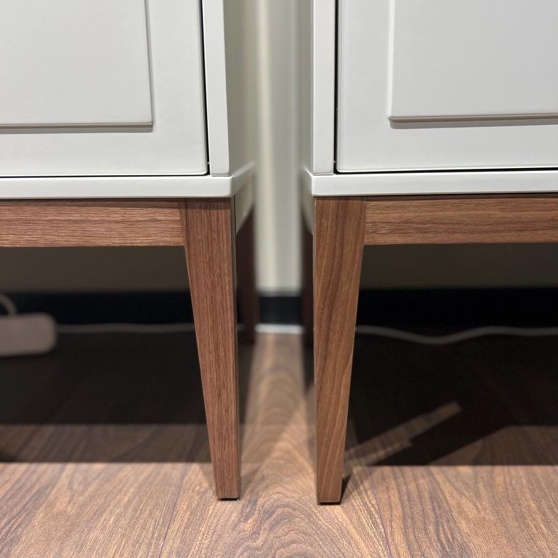 Корпус комода выполнен из высококачественного МДФ высокой прочности в отделке матовый лак светло-серого оттенка. База комода изготовлена из массива дерева с покрытием из натурального шпона ореха.