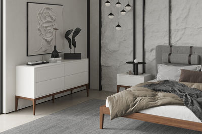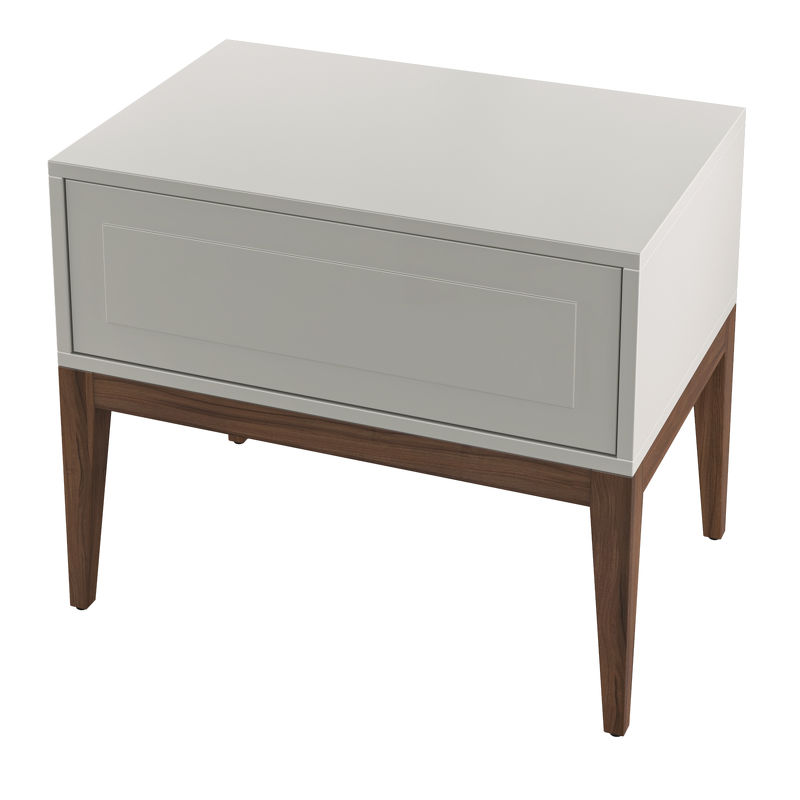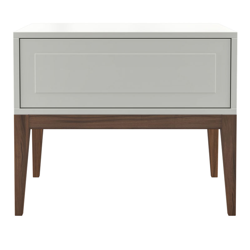 Прикроватная тумбочка с одним ящиком, в сером оттенке, на высоких стройных ножках из коллекции Marbella от известной бренда MOD Interiors. Лаконичная дизайнерская фрезеровка в актуальном стиле.