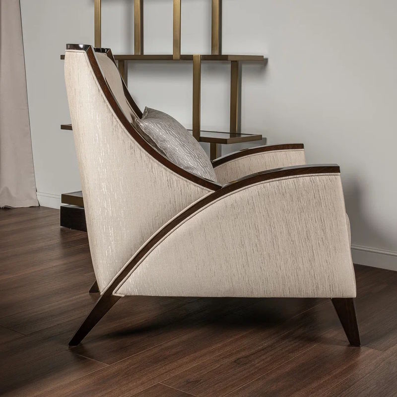 Кресло выполнено в стиле Ар-деко. Каркас изготовлен из массива бука. Наполнитель пенополиуретан, ножки массив бука. Кресло обито тканью из ассортимента фабрики в светло-бежевых тонах. Тип ткани - жаккард. Состав ткани 66% полиэстер, 34% хлопок.