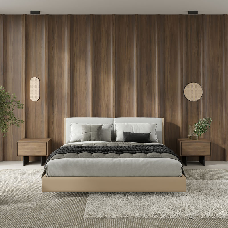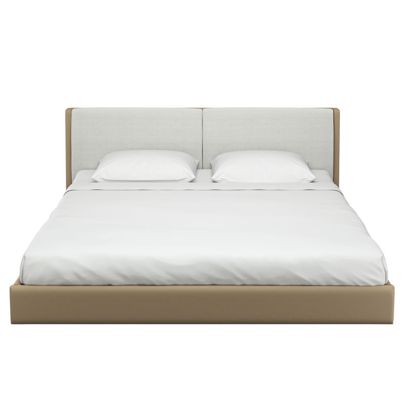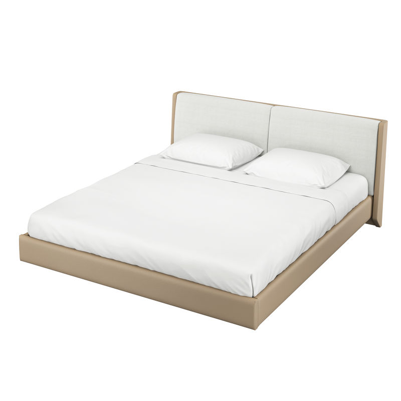 Каркас кровати выполнен из высококачественного, сертифицированного МДФ высокой плотности. База кровати обита эко-кожей в бежевых тонах. Изголовье выполнено в виде двух больших подушек. Подушки на изголовье в ткани рогожка в белом оттенке. Двойное переплетение нитей обеспечивает ей особую прочность. Ткань мягкая, вызывающая приятные тактильные ощущения. Ножки кровати изготовлены из металла.