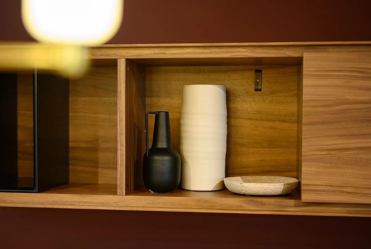 Подвесной модуль выполнен из высококачественного, сертифицированного МДФ высокой плотности. Отделка - натуральный шпон северо-американского ореха. Вставка-разделитель в открытой полке выполнена из метала и окрашена в черный матовый цвет.