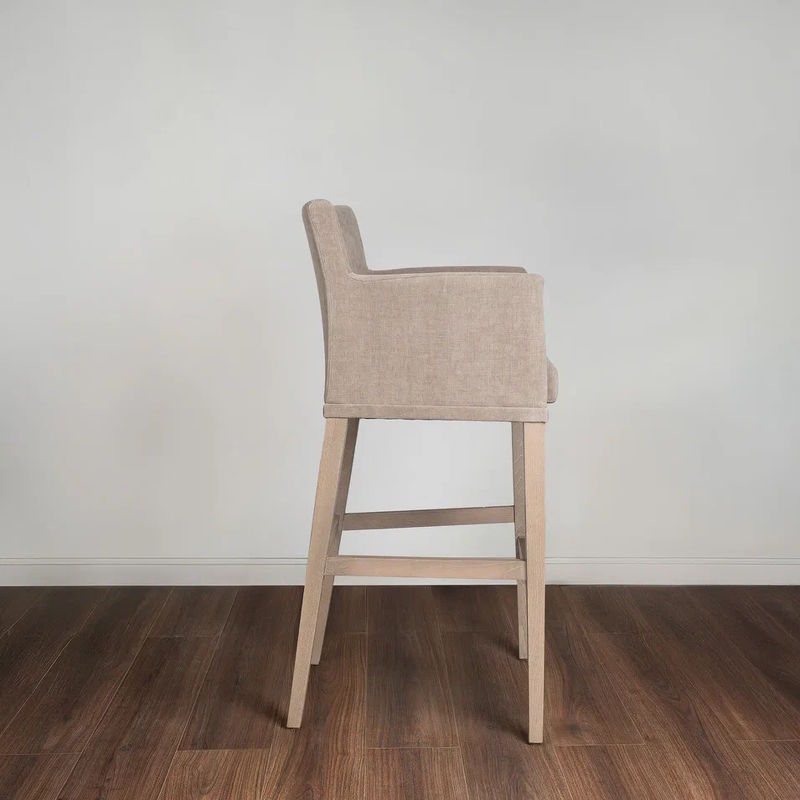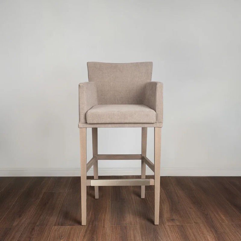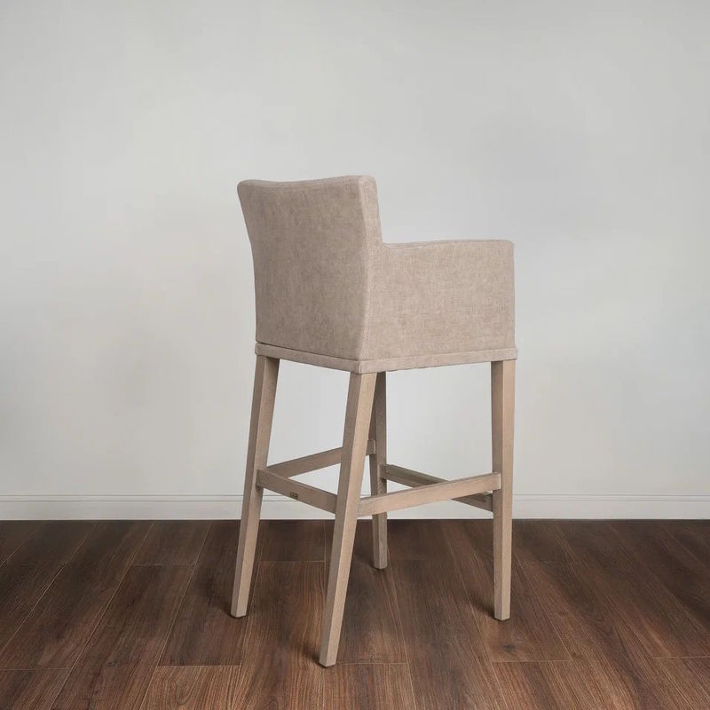 Барный стул на основании из массива бука с металлическим декорированием латунью выполнен в современном стиле. Отлично дополнит интерьер гостиной комнаты или столовой.