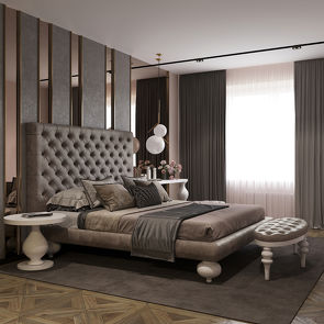 Кровать с решеткой, отделка белый блестящий лак, ткань бежевый велюр