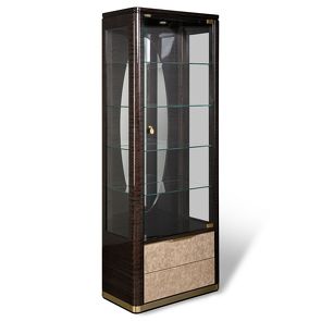 Витрина, отделка 786 глянцевый шпон эвкалипта mink, M04 черный никель, кожа, подсветка